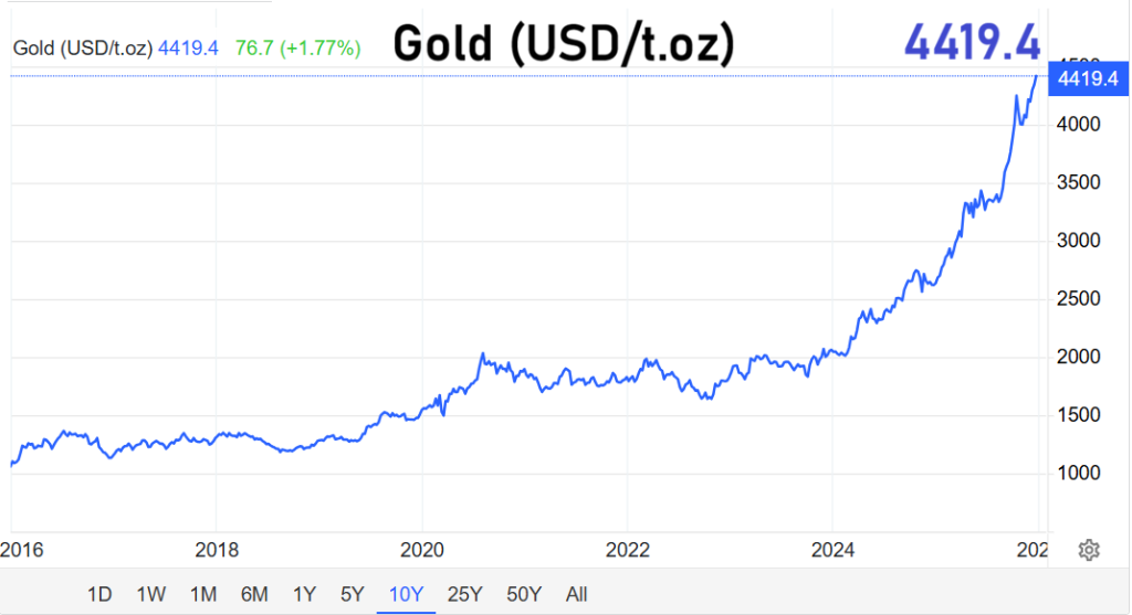 Die Edelmetallmärkte haben zu Beginn der neuen Handelswoche ein deutliches Lebenszeichen gesendet. Vor allem Gold, das im gesamten Jahr 2025 als einer der stärksten Vermögenswerte galt, setzte seinen Aufwärtstrend mit neuer Dynamik fort. Die Feinunze kletterte am Morgen um 1,6 Prozent auf 4.410 US-Dollar – ein frisches Allzeithoch und zugleich das Ende einer mehrwöchigen Seitwärtsphase.