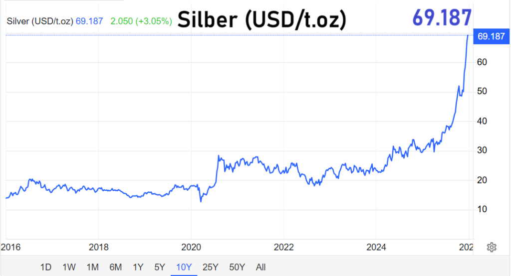 Auch Silber zog zum Wochenauftakt kräftig an und setzte die über Monate andauernde Hausse fort. Mit einem Anstieg von 2,3 Prozent erreichte die Feinunze 68,71 US-Dollar – ebenfalls ein historischer Rekordwert. Damit rückt die symbolträchtige 70-Dollar-Marke in unmittelbare Nähe.